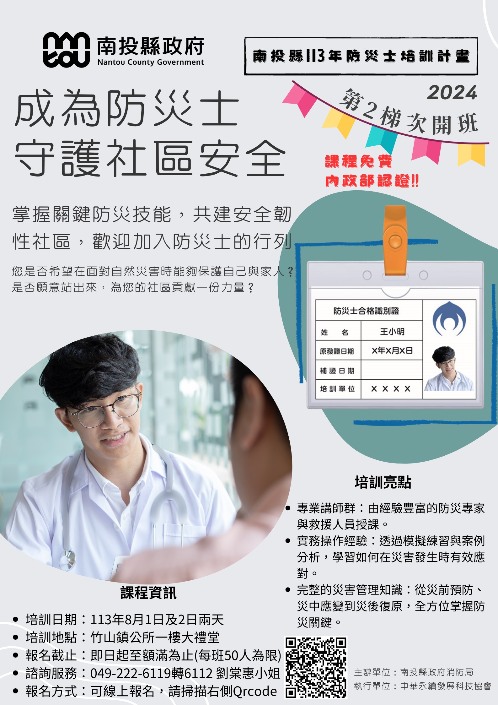 南投縣113年度防災士培訓第二梯次(竹山場)、第三梯次(南投場)課程開放報名,歡迎踴躍參加