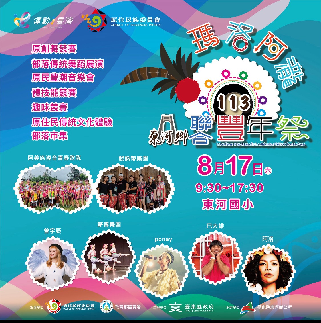 臺東縣東河鄉公所謹訂於113年8月17日(星期六)辦理聯合豐年祭活動: (一) 活動時間:上午9時30分至下午17時30分。 (二) 活動地點:東河國小運動場。 (三) 聯合慶豐年活動現場有傳統舞蹈展演、原創舞競賽、原民豐潮音樂會、體技能競賽、趣味競賽、原住民文化體驗、部落市集、部落農特產、手工藝品等,竭誠歡迎蒞臨參與活動。 (四) 本活動相關資訊請逕上本所官網:https://reurl.cc/rv83YO(首頁/訊息廣場/鄉內活動/113瑪洛阿瀧聯合豐年祭)查詢。