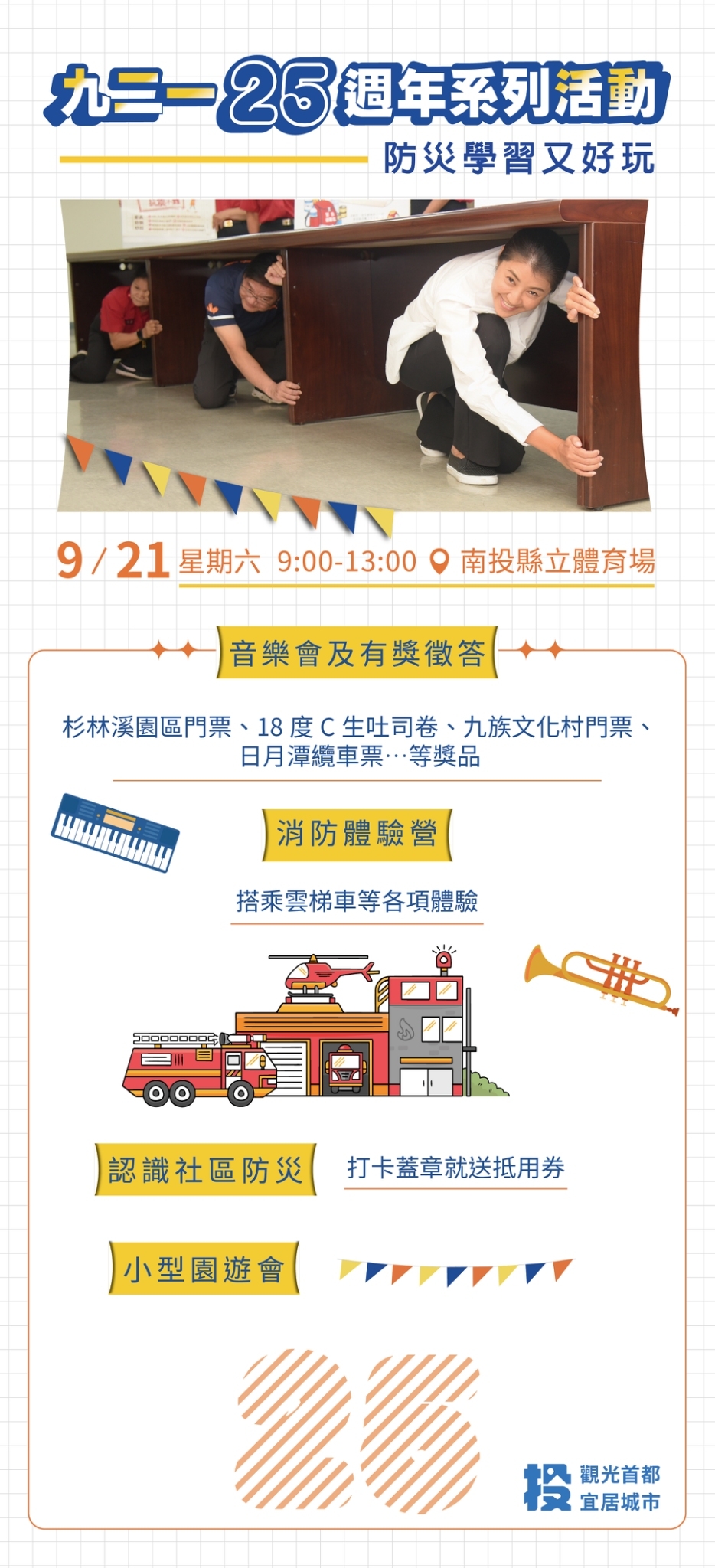 南投縣政府將訂9月21日上午9時,假南投縣立體育場辦理『九二一25周年系列活動』,現場結合音樂會、園遊會及豐富消防體驗,歡迎鄉親朋友踴躍參加!